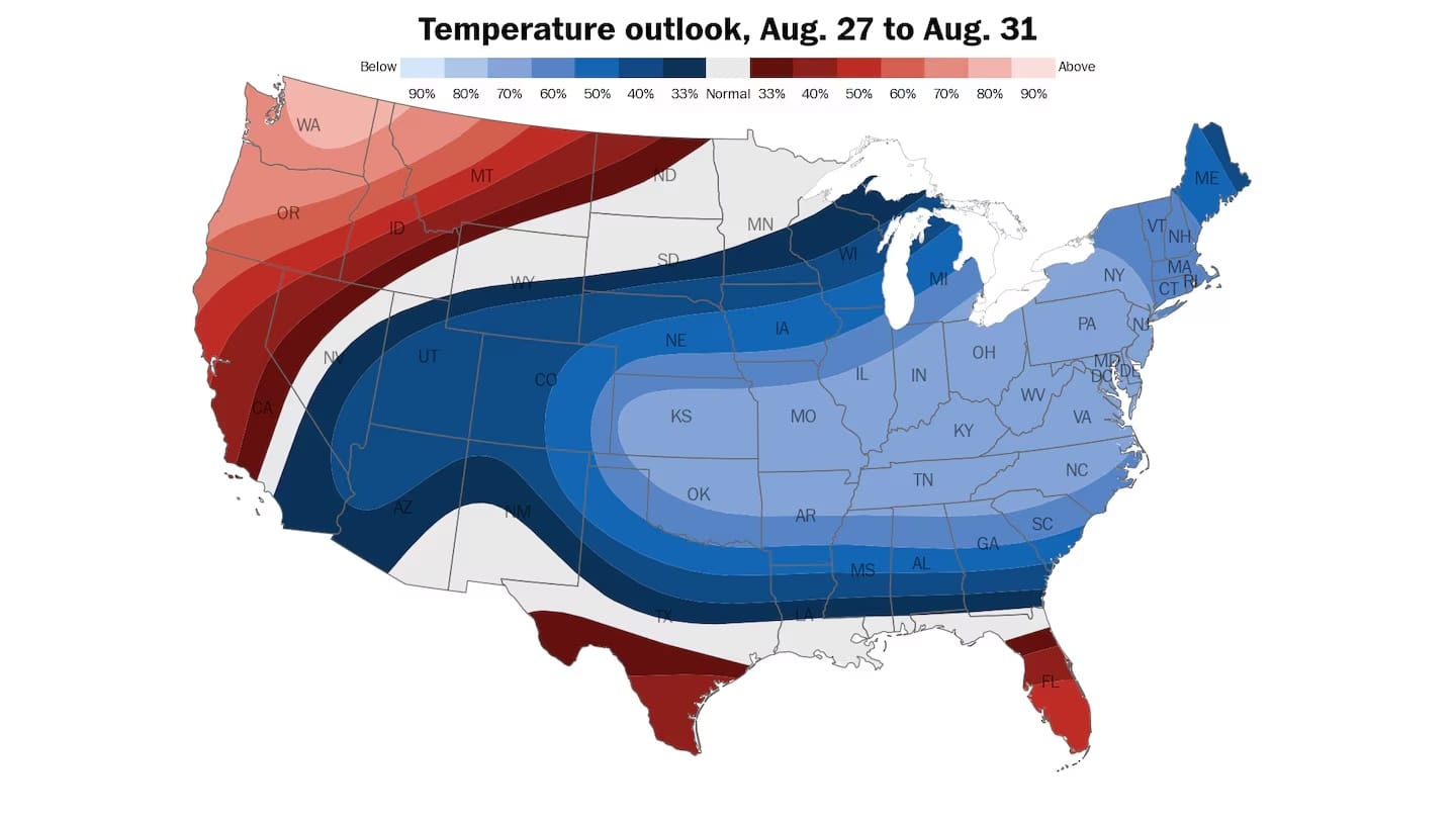 🍂"A Taste of Fall": Thanks to an air mass from Canada and Hurricane Erin, parts of the northern U.S. can expect "fall-like" temps by mid-week. If you're not in the north, don't despair: 45 states will see below average temps as well.