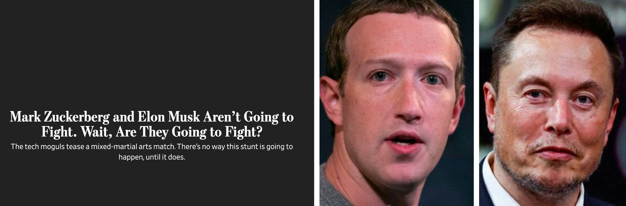 Twitter owner Elon Musk tweeted last week in reference to Facebook founder Mark Zuckerberg, who has recently shared more about practicing jujitsu on his Instagram account. Zuckerberg replied on Instagram stories, “Send me location,” to which Musk said, “If this is for real, I’ll do it.” The center of this online tension? Maybe just a friendly jousting OR Zuckerberg’s plans at Meta (Facebook’s parent company) to roll out a Twitter rival... ? However, whether two of the world’s wealthiest people will actually meet in the octagon is TBD. As The Wall Street Journal's Jason Gay writes: "No, I don’t think Mark Zuckerberg is going to fight Elon Musk in a steel cage. And yes, this is why I worry Mark Zuckerberg is going to fight Elon Musk in a steel cage."