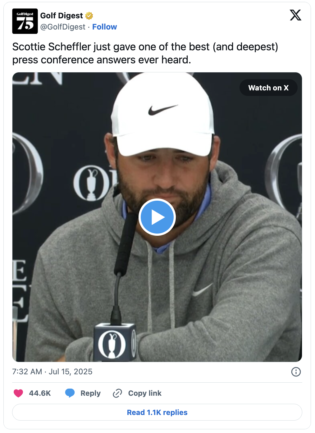 Scotty Scheffler this week during a press conference ahead of the British Open. One of the best player's in the world got candid about how important his family is to him. He spoke on the fact that while he loves to golf for a living, the accomplishments of a win are fleeting. On the other hand, fatherhood and his family offer a fulfillment from the "deepest places of your heart."